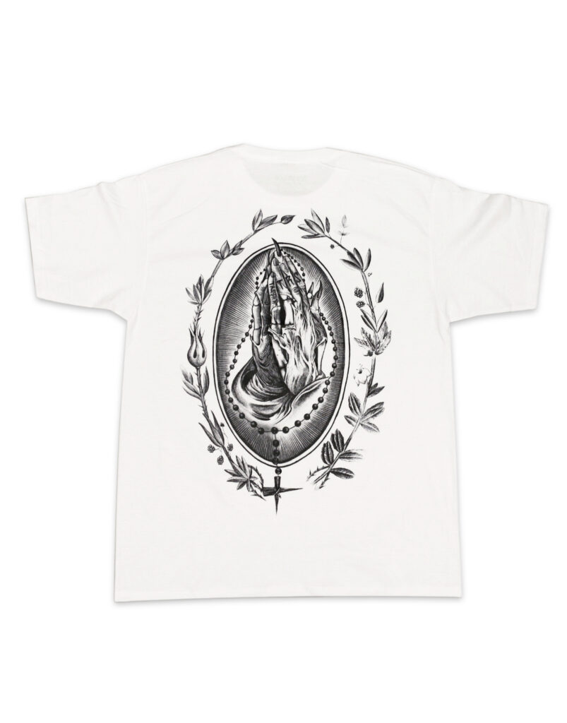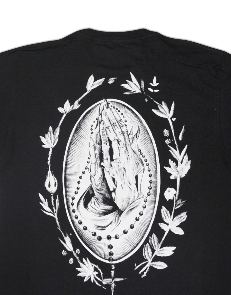 Playera negra con diseño grande de manos rezando y detalles icónicos de la cultura lowrider. Algodón premium, perfecta para destacar tu identidad.