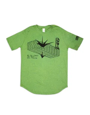Playera verde con diseño de origami y letras urbanas, inspirada en el arte callejero.