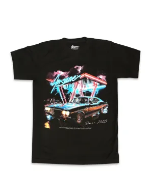 Playera negra con estampado de lowrider y luces de neón. Inspirada en la cultura del carro.